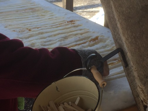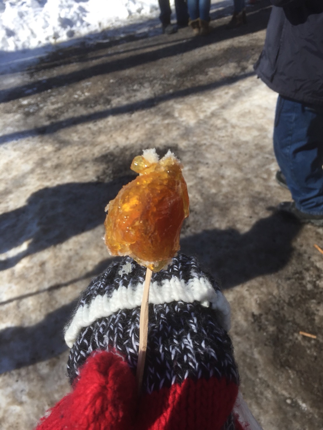 メープルタッフィーっていうお菓子なんですけど、ホストがおごってくれました。メープルシロップを雪の上に垂らして固めて雪にぐるぐる巻いて食べるべっこう飴みたいな感じです。